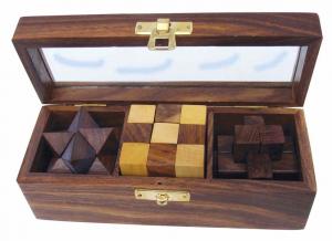 3 Knobelspiele in der Box mit Glasdeckel, Holz, 17,5x6,5x6cm