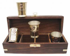 4 Schnapsbecher, Messing, H: 5cm, Dm: 3,8/3,4cm, in der Holzbox,