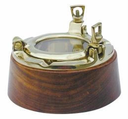 Bullaugenaschenbecher, Messing mit Holzeinfassung, Glas im Decke