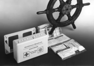 Ein Erste-Hilfe-Kasten mit einer Inhaltszusammenstellung für die Anforderungen des Bordgebrauchs: