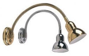 Kabinenleuchte. Gehäuse: Messing poliert und schutzlackiert oder verchromt. Reflektor: Allseitig verstellbar, Innenseite weiß lackiert. Elektrik: Eingebauter Druckschalter, Schraubanschluß 2polig. Kabeleinführung: von hinten. Leuchtmittel: Glühlampe in Kugelform mit Sockel BA 15d bis 25W (nicht im Lieferumfang enthalten).Gelenkversion