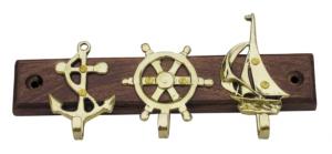 Schluesselhaken mit Anker, Steuerrad & Segelboot, Messing auf Ho